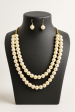 Necklace: A stunning double-strand pearl necklace, crafted with lustrous, round cream-white pearls of uniform size. The pearls are symmetrically arranged, giving the necklace a luxurious and timeless appeal.