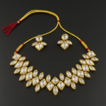 The matching earrings are designed in a floral-inspired motif, adorned with sparkling Kundan stones in round, marquise, and diamond shapes.