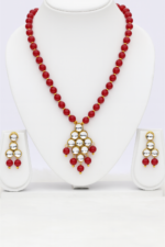 Elevate your style with this exquisite handcrafted jewellery set, featuring a bold red beaded necklace paired with a stunning statement pendant. The pendant is beautifully adorned with shimmering silver-toned spheres accented in gold, complemented by matching drop-style earrings that add a perfect finishing touch.