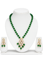 Unveil timeless beauty with our signature green stone jewellery set, crafted to perfection. Featuring a stunning floral pendant adorned with rich emerald-like stones on a sleek black beaded chain, this piece radiates charm and sophistication. Paired with matching teardrop earrings, it creates the perfect balance of tradition and modern grace. 💎 Why Choose This Set? Premium craftsmanship with exquisite detailing Versatile design – perfect for festive, bridal, and everyday elegance A statement piece that reflects luxury and confidence Celebrate your beauty with jewellery that speaks your style. This elegant jewellery set features a stunning necklace paired with matching earrings, designed to radiate sophistication and charm. 🌿 Necklace Details: Crafted with lustrous round green beads, strung together with golden spacers for a luxurious finish. Accented with additional green beads at the edges, the pendant strikes a balance between tradition and modern elegance. The necklace sits gracefully on the neckline, making it ideal for festive, bridal, or evening wear. 💎 Earring Details: Each earring is embellished with One dangling green beads, adding a touch of movement and charm. Lightweight yet striking, these earrings complete the coordinated look effortlessly.