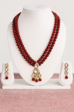 Make every occasion unforgettable with this double-strand deep red beaded necklace paired with matching drop earrings. The necklace features rich, glossy red beads adorned with a gold and crystal-studded pendant, adding a regal charm and striking brilliance. The matching earrings perfectly complement the necklace with their elegant crystal and bead detailing, making the set a flawless choice for weddings, festive celebrations, and grand soirées. ✨ Why You’ll Love It: Premium double-strand red beads for a bold statement Gold accents with sparkling crystal embellishments Matching designer earrings for a complete look Perfect blend of tradition and contemporary elegance 🌹 Step into luxury with timeless elegance — only with DASHKALA Jewellery 🌹
